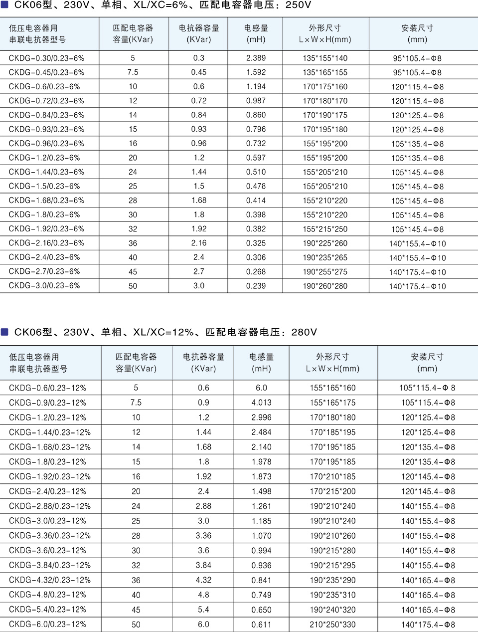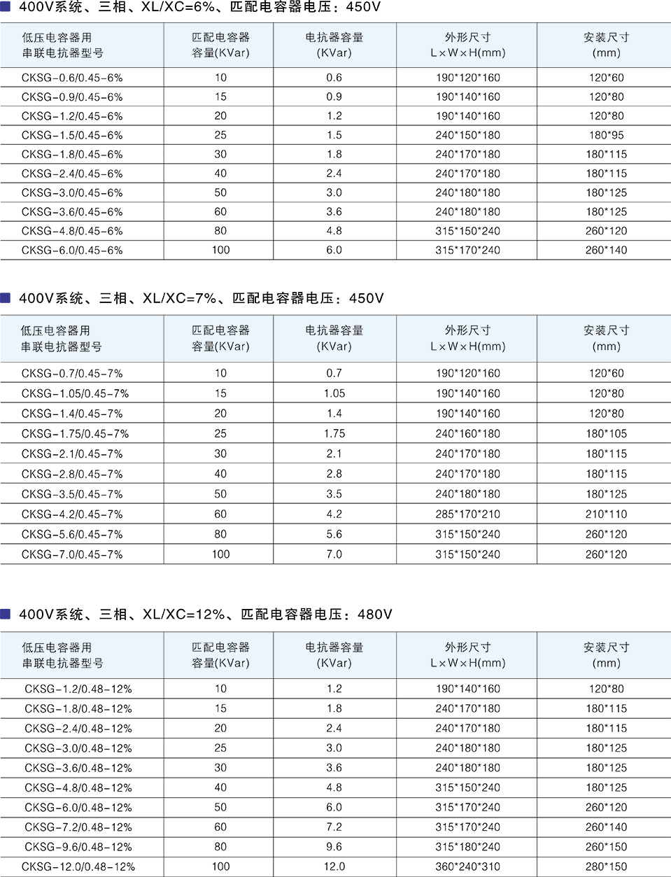 CKDG、CKSG系列低壓串聯(lián)電抗器里面通過的是交流電,它的作用是與功率因數(shù)補償電容器并聯(lián),對穩(wěn)態(tài)性諧波(5、7、11、13次)構(gòu)成串聯(lián)諧振。通常有電抗率 4.5-6%電抗器,對5次諧波通常電抗率為6%屬于高感值電抗器,對3次諧波通常電抗率為12~13%,對2次諧波通常電抗率為26~27%屬于高 感值電抗器。 接入串聯(lián)電抗器,能有效地吸收電網(wǎng)諧波,改善系統(tǒng)的電壓波形,提高系統(tǒng)的功率因數(shù),并能有效地抑制合閘涌流及操作過電壓, 有效地保護了電容器。